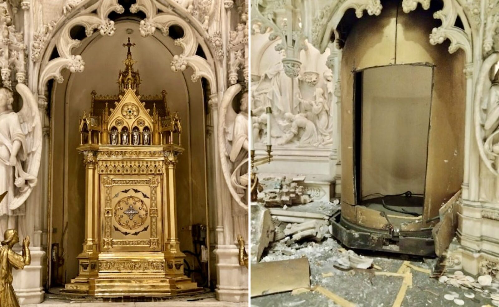 The solid silver tabernacle, which was coated in 18-karat gold, was ripped out of St. Augustine Roman Catholic Church late last week, and statues of angels flanking the altar were also decapitated.
