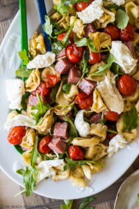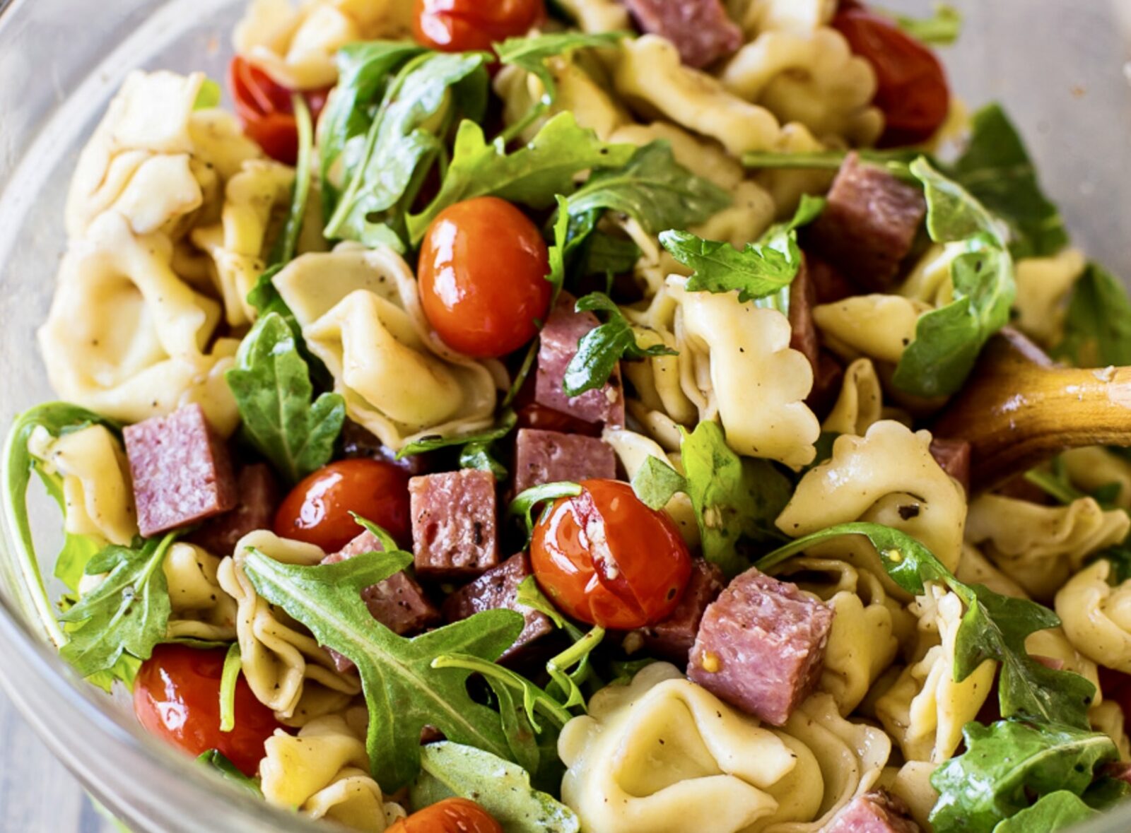 - To a large bowl, add cooled tortellini, tomatoes, salami, arugula and mozzarella and toss gently with about 1/2 cup of the balsamic vinaigrette dressing.