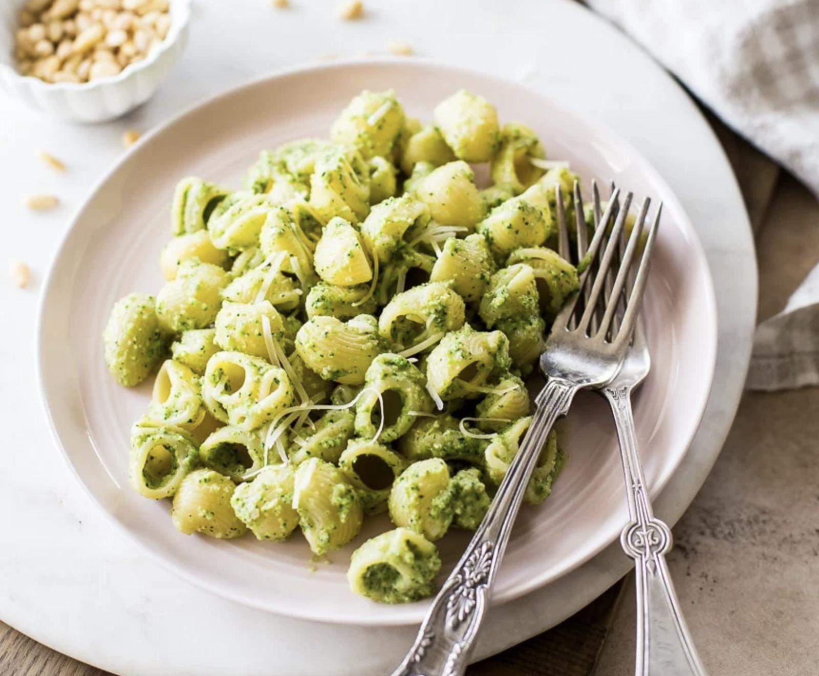 - Drain the pasta, reserving one cup of the pasta water in a measuring cup. In a small saucepan, cook the pine nuts over medium heat until toasted and fragrant, about 3 minutes.