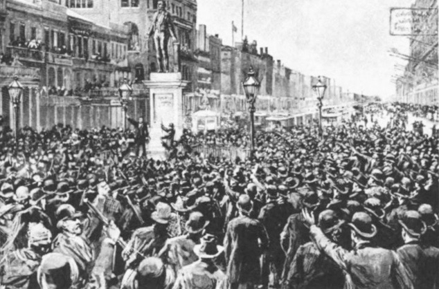 Nearly 8,000 people amassed in front of the Clay Statue, then located near the corner of St. Charles and Canal Street. There, the people were addressed by W.S. Parkerson, Walker D. Denegre, and John C. Wickcliffee, who showed not only dissatisfaction with the outcome of the trial, but outright disgust. Their words further inflamed a crowd that had already reached the boiling point.